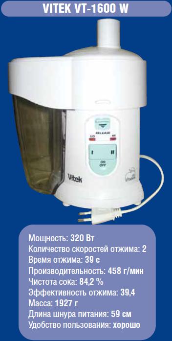 Самая мощная. При этом легкая, лишь немногим тяжелее, нежели Tefal. Благодаря высокой мощности, быстро отжалась. И с хорошей производительностью. Но вот КПД - выход сока – слабее некуда. Не дотягивает даже до 40%. Из 300 г моркови получается только 120 г сока. Оставляет желать много лучшего и качество фильтрации: в «vitekовском» соке больше, чем в каком-либо другом, мякоти и взвесей. Шнур питания такой куцый, что затруднительно будет обойтись без электроудлинителя. Зато, единственная из всех, укомплектована дополнительной насадкой для цитрусовых.