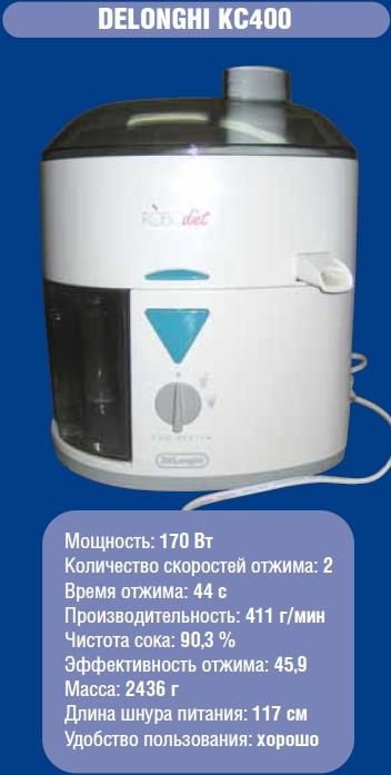 По мощности и по функциональным параметрам стоит где-то в серединке. Каких либо особых претензий нет. Разве что излишне шумновата. Бункер для мезги переполняется после переработки 500-600 г продукта и, чтобы его опорожнить, соковыжималку приходится разбирать. Самый длинный шнур питания. Единственная из соковыжималок, удостоенная оценки «отлично» по результатам теста на удобство пользования.